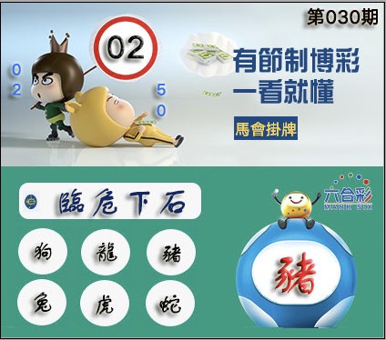 030期正版彩图挂:02 爆:猪 挂牌成语:临危下石 挂牌出肖:狗龙猪兔虎蛇