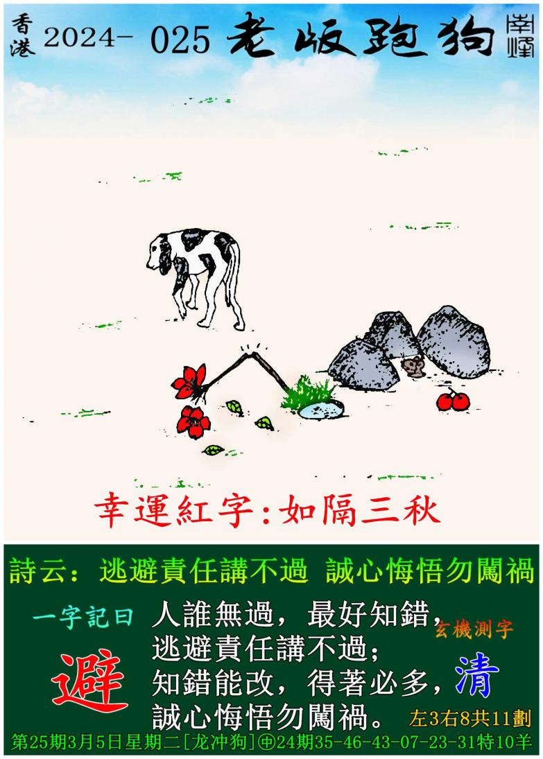 025期老版跑狗一字記之曰:【避】 玄機測字:《清》