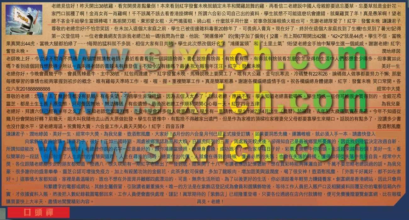 【1】.老總見信好!昨天開出38號雞,看完開獎差點暈倒!本來看到紅字發奮未晚就鎖定未羊和聞雞起舞的雞,再看信二老總說中國人母親節要送忘憂草,忘憂草就是金針花,家門口就種了啊!金肖女肖一肖雞啊!千不該萬不該去看香港掛牌啊!所謂六合彩公司自己出的資料,學生就想不可能這麼坑會連錯,就棄雞買了羊!真是愚笨啊!望老總不吝金手給學生當頭棒喝!高祖開刃棍、東邪愛女棍、天門搗蛋棍、過山棍,什麼就手用什麼,若事急就操根燒火棍也可,先謝老總厚愛了!紅字:發奮未晚  謙謙君子