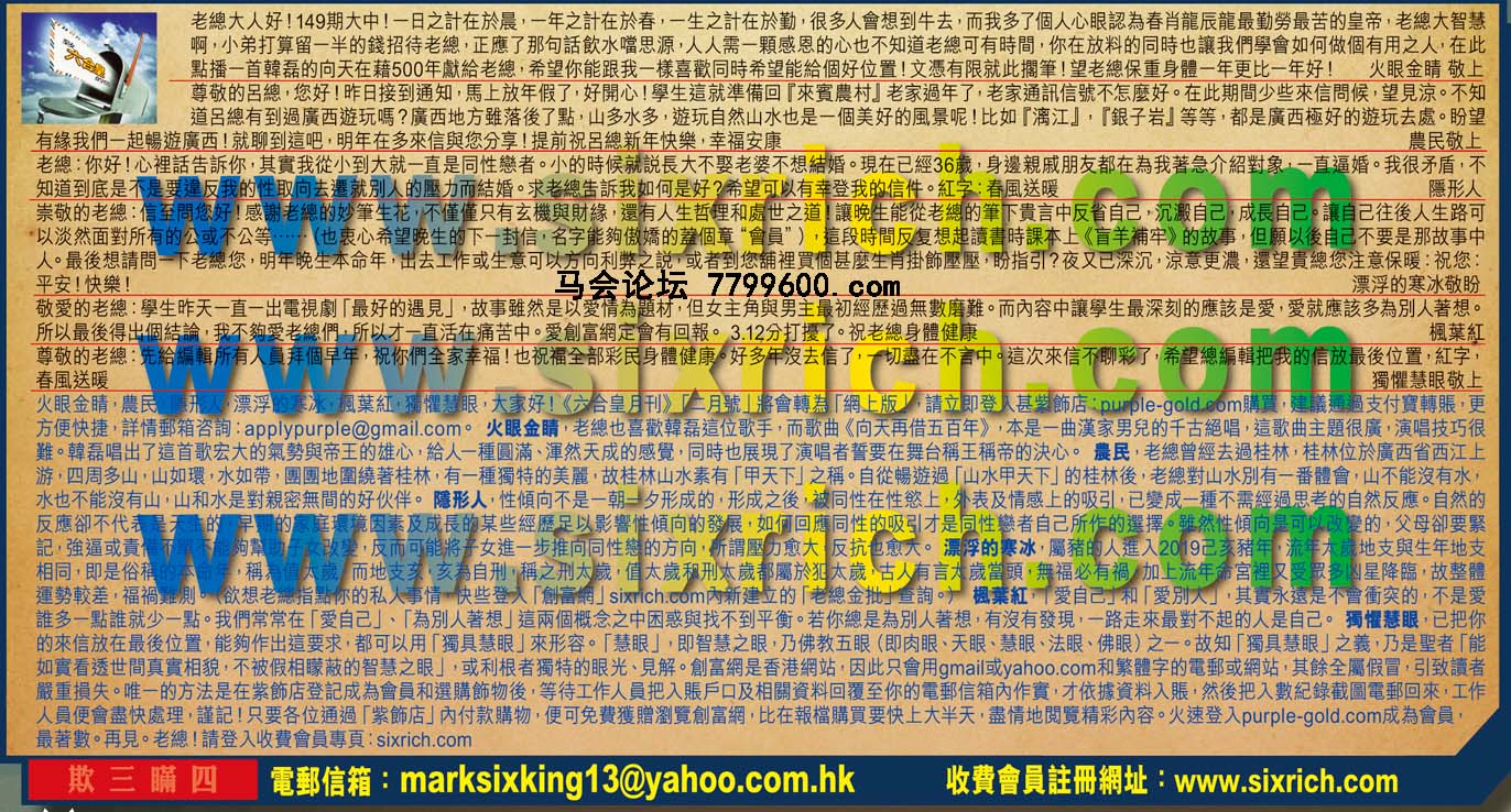 【1】老總大人好! 149期大中!一日之計在於晨,一年之計在於春,一生之計在於勤,很多人會想到牛去.而我多了個人心眼認為春肖龍辰龍最勤勞最苦的皇帝.老總大智慧啊,小弟打算留一半的錢招待老總,正應了那句話飲水嘴思源,人人需一顆感恩的心也不知道老總可有時間,你在放料的同時也讓我們學會如何做個有用之人,在此點播一首韓磊的向天在藉500年獻給老總,希望你能跟我一樣喜歡同時希望能給個好位置!文憑有限就此攔筆!望老總保重身體一年更比一年好! ---火眼金睛 敬上