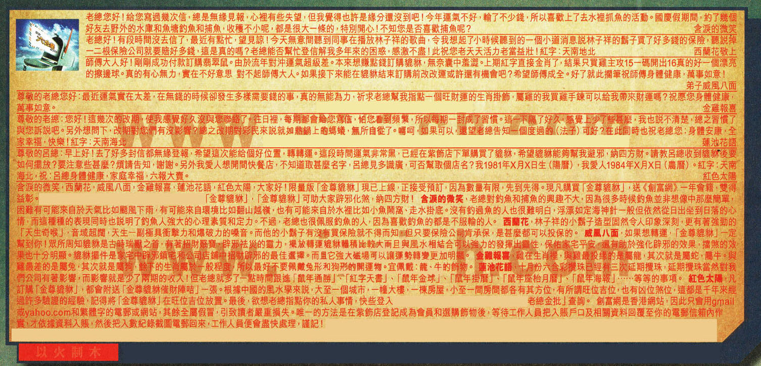 【6】尊敬的呂總:早上好!去了好多封信都無緣登報,希望這次能給個好位置,轉轉運。這段時間運氣非常黑,已經在紫飾店下單購買了貔貅,希望貔貅能夠幫我避邪,納四方財。請教呂總收到貔貅後要如何擺放?要注意些甚麼?煩請告知,謝謝。另外我愛人想開間快餐店,不知道取甚麼名字,呂總見多識廣,可否幫取個店名?我1981年X月X日生(陽曆),我愛人1984年X月X日(農曆)。紅字:天南海北,祝:呂總身體健康,家庭幸福,六報大賣。 紅色太陽