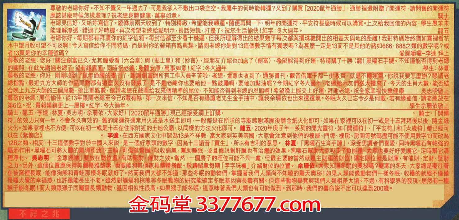 【6】尊敬的老總展信愉佳'從13年跟隨老總至今已6载有餘'第次來信,不知是否有緣讓老先生金手抽中'讓我余珊依也出來透透氣。冬眠太久已忘今夕是何载,若有緣登信,請老總放在第6位。祝:貴報暢銷更上一層樓。紅字:冬大通年。-----學生佘珊敬上
