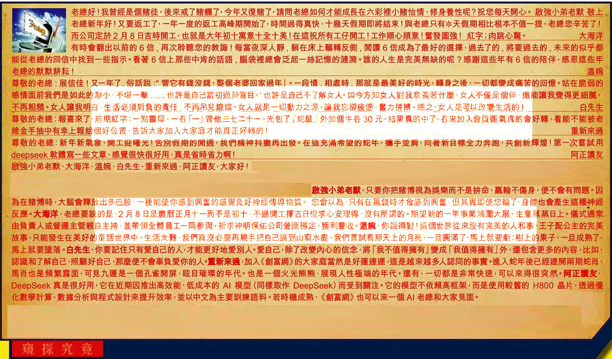 【6】.尊敬的老總:新年新氣象,開工迎曙光!告別假期的閒適,我們精神抖擻再出發。在這充滿希望的蛇年,攜手並肩,向著新目標全力奔跑,共創新輝煌!第一次嘗試用deepseek軟體寫一些文章,感覺很快很好用,真是省時省力啊!  阿正讀友