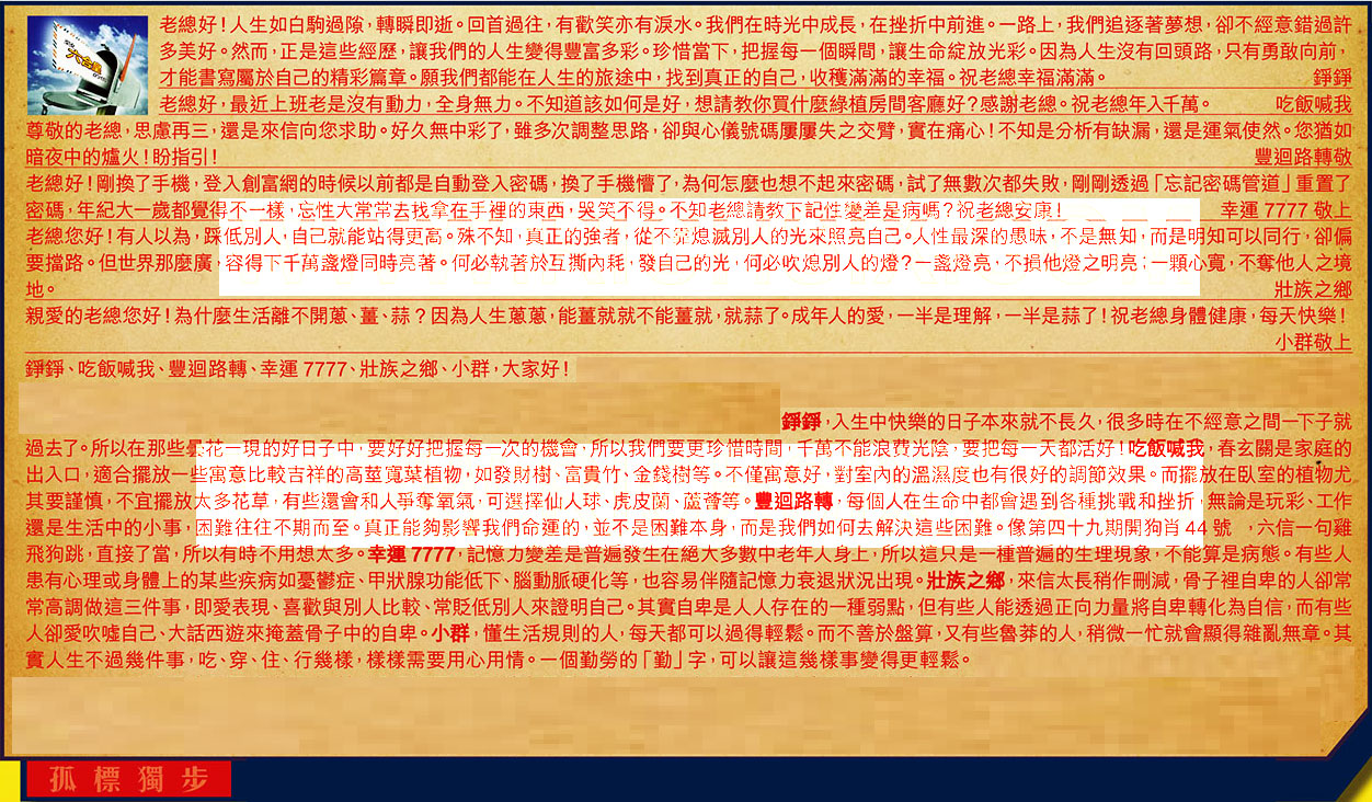 【4】.老總好!剛換了手機, 登入創富網的時候以前都是自動登入密碼,換了手機懵了,為何怎麼也想不起來密碼,試了無數次都失敗,剛剛透過「忘記密碼管道」重置了密碼,年紀大一歲都覺得不一樣,忘性大常常去找拿在手裡的東西,哭笑不得。不知老總請教下記性變差是病嗎?祝老總安康! 幸運7777 敬上