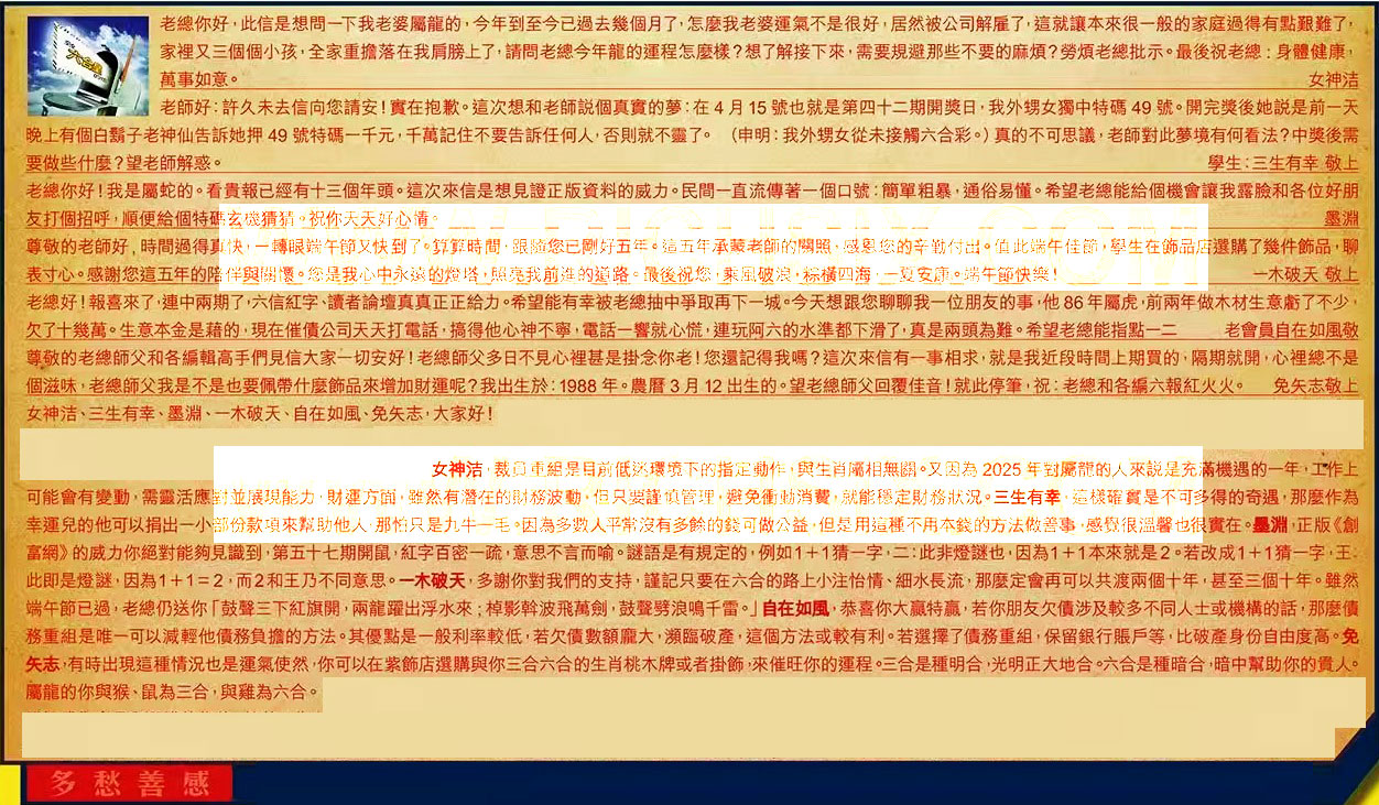 【2】.老師好:許久未去信向您請安!實在抱歉。這次想和老師說個真實的夢:在4月15號也就是第四十二期開獎日,我外甥女獨中特碼49號。開完獎後她說是前一天晚上有個白鬍子老神仙告訴她押49號特碼一千元,千萬記住不要告訴任何人,否則就不靈了。(申明: 我外甥女從未接觸六合彩。)真的不可思議,老師對此夢境有何看法?中獎後需要做些什麼?望老師解惑。 學生:三生有幸敬上